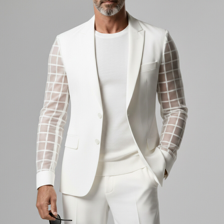 Men's Fashion White Patchwork Sheer Plaid Organza Peak Lapel Long Sleeve Blazer