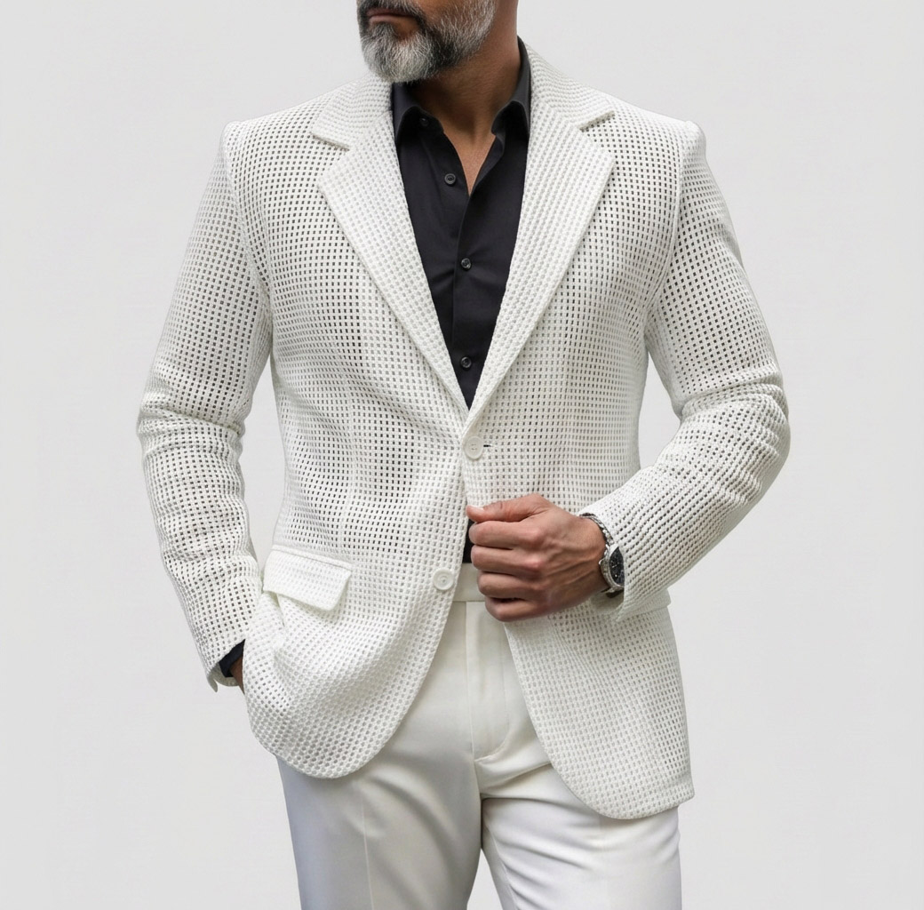 Men's White Hollow Out Notched Lapel Single Breasted Long Sleeve Blazer