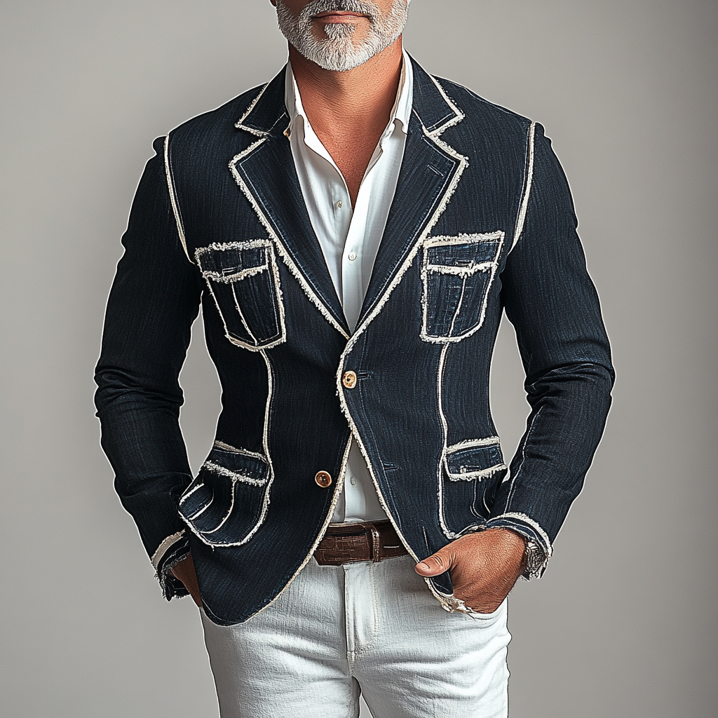 Men's Business Denim Notch Lapel Buttons Flap Pocket Blazer