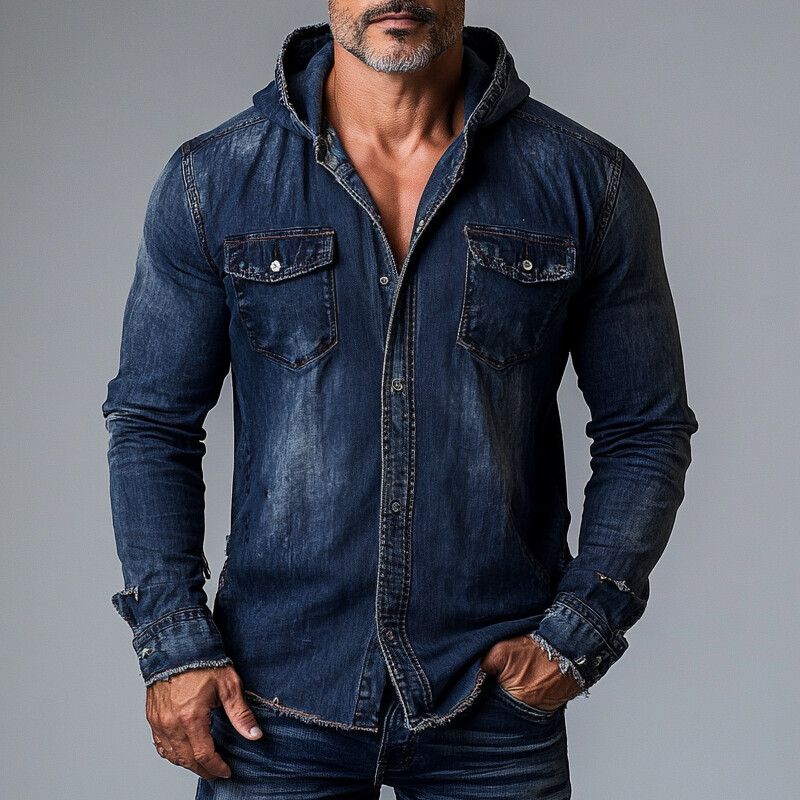 Men's Denim Long Sleeve Button Chest Pocket Hooded Shirt