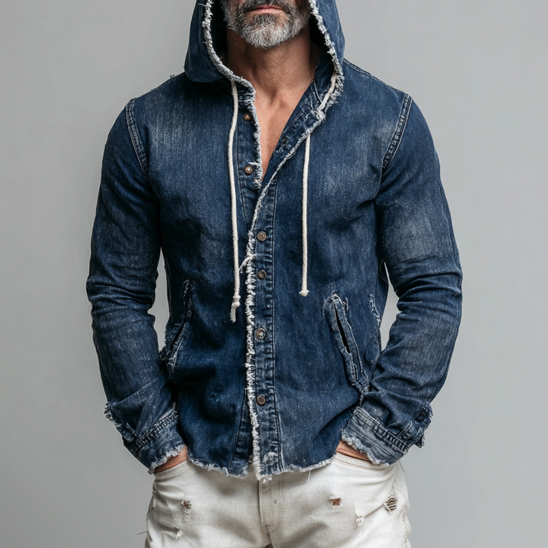 Men's Casual Denim Button Up Long Sleeve Hooded Shirt