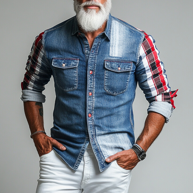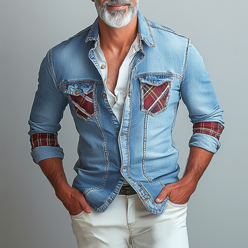 Men's Washed Denim Check Single Breasted Chest Pocket Shirt
