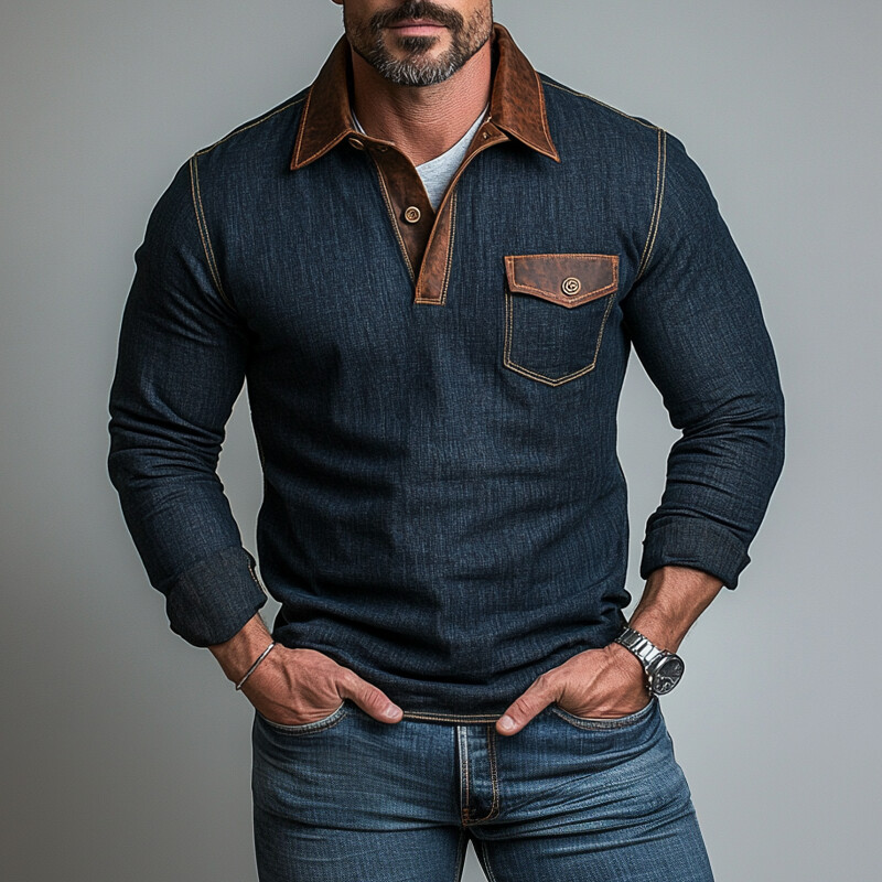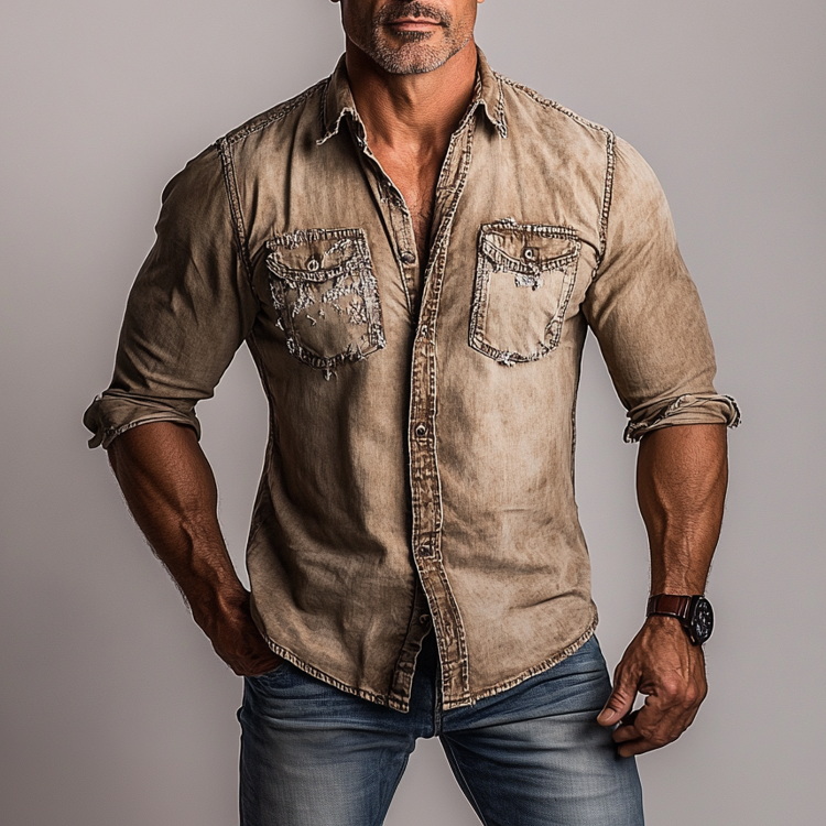 Men's Retro Distressed Denim Single Breasted Long Sleeve Shirt