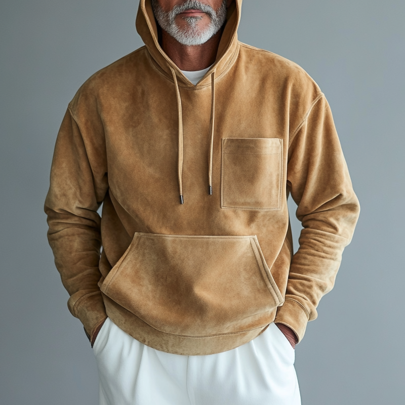 Men's Suede Chest Pocket Long Sleeve Drawstring Casual Hoodie