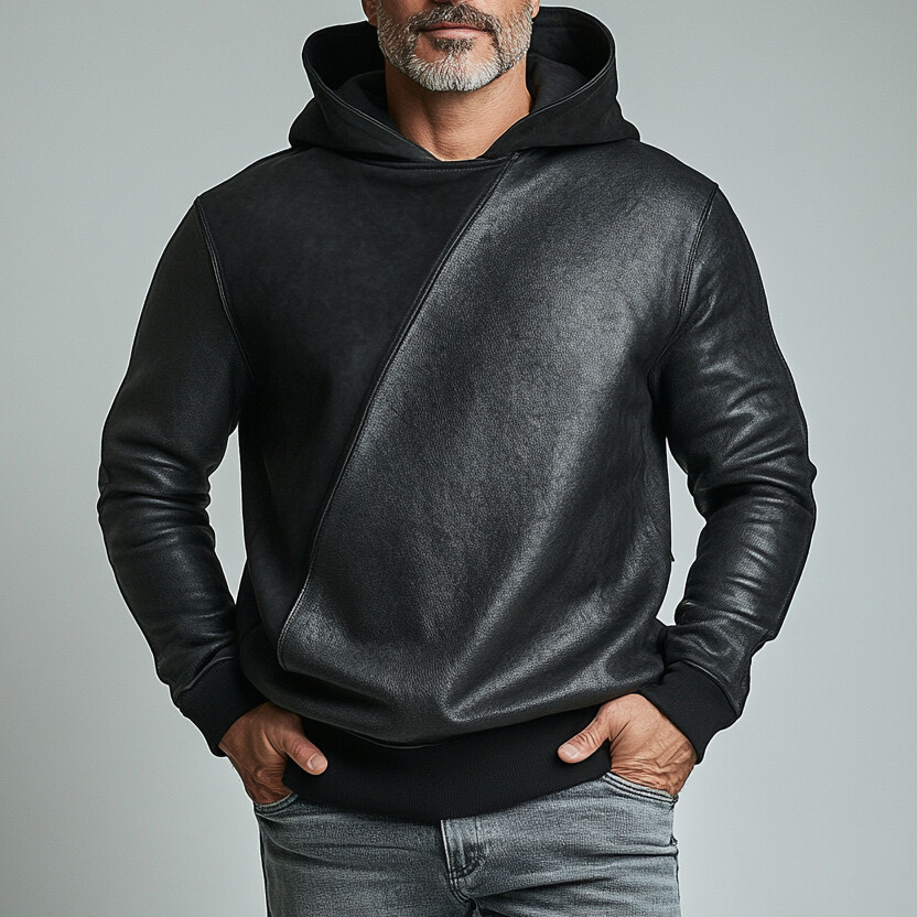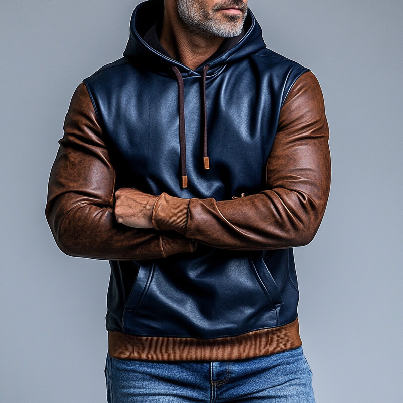 Men's PU Leather Two Tone Pocket Long Sleeve Drawstring Hoodie