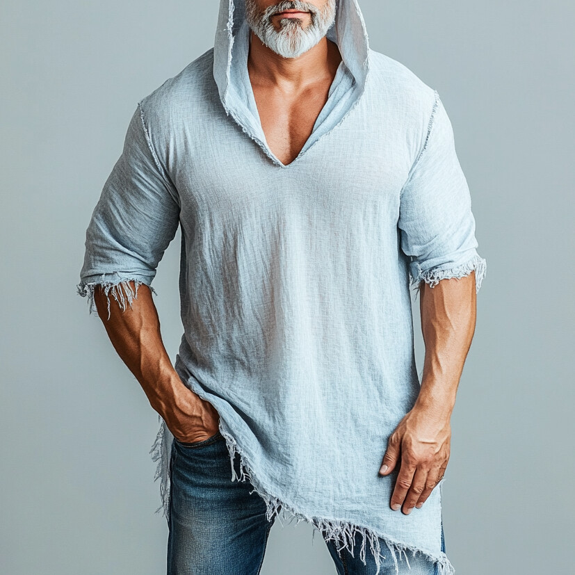 Men's Raw Edge 3/4 Sleeve Irregular Hem Hooded Shirt