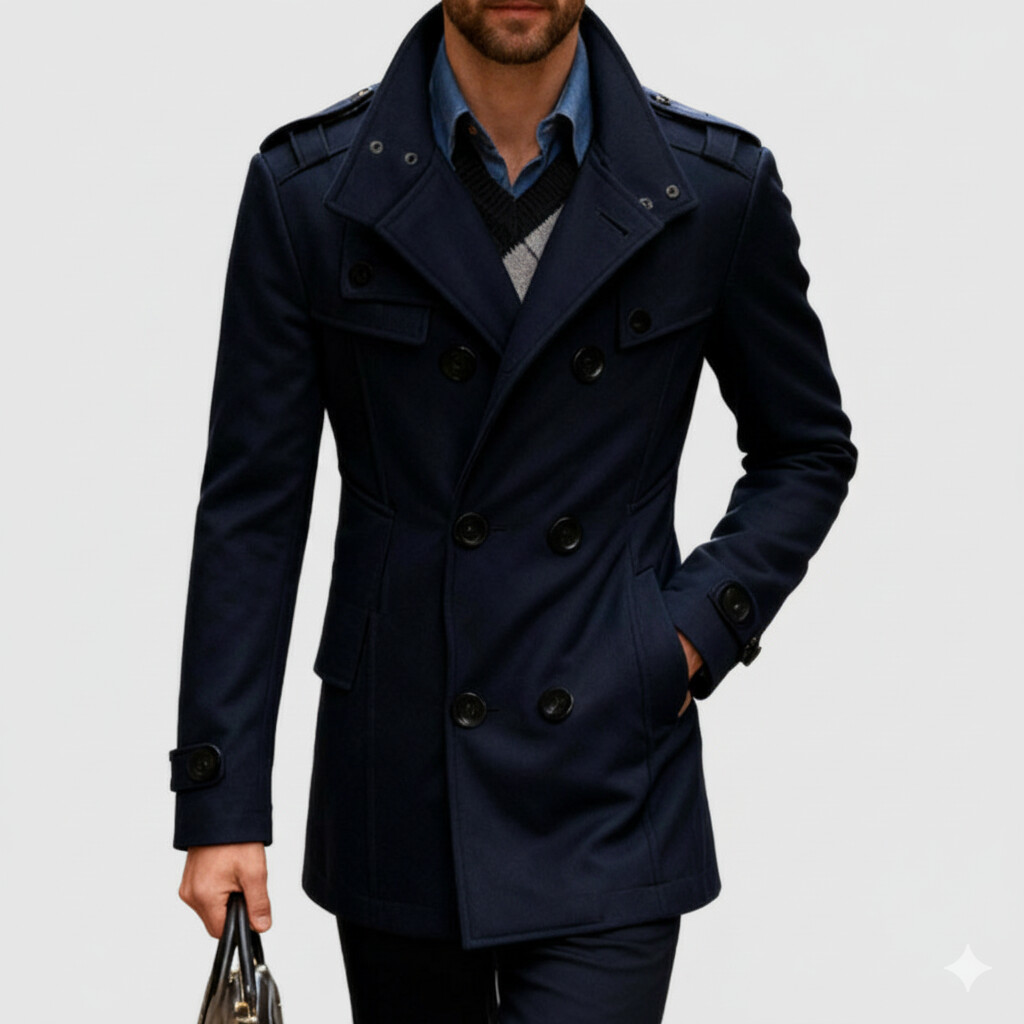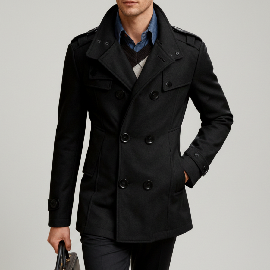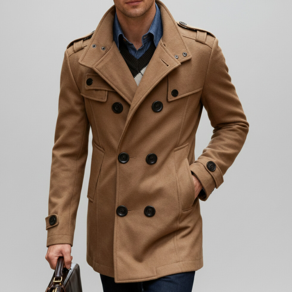 Men's Khaki Stand-Up Collar Long Sleeve Double Breasted Pocket Woolen Trench Coat