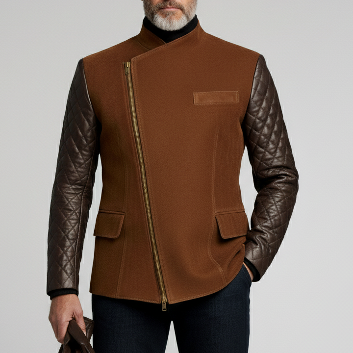 Men's Brown Suede Patchwork Quilted PU Leather Long Sleeve Stand Collar Asymmetrical Zipper Jacket