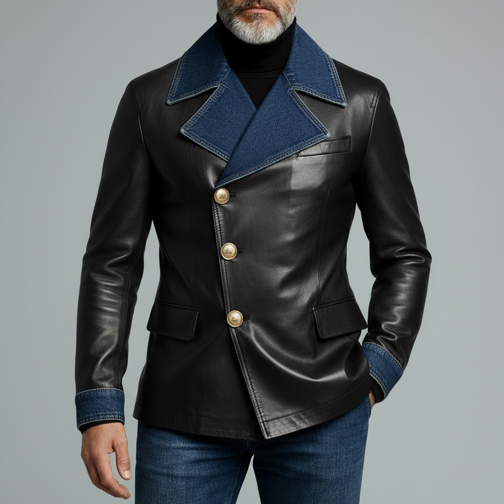 Men's Black Colorblock Lapel Long Sleeve Asymmetrical Gold Button PU Leather Jacket