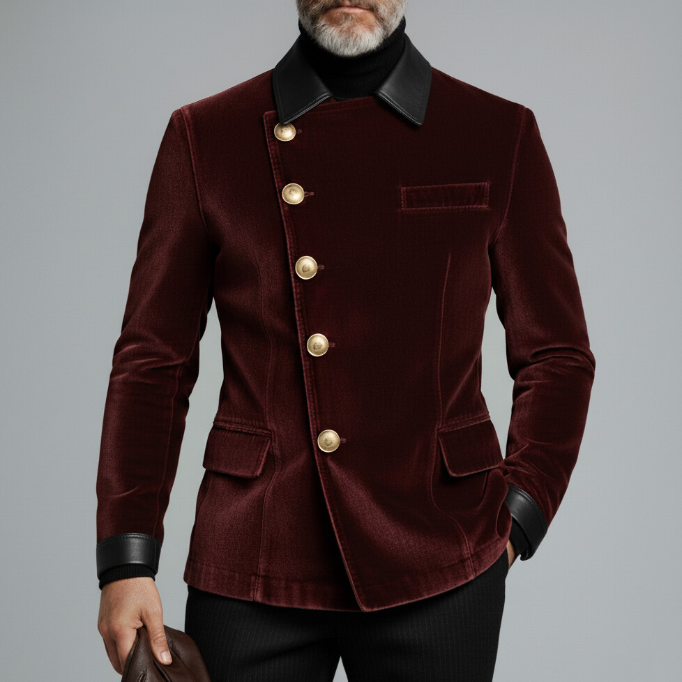 Men's Burgundy Velvet PU Shirt Collar Long Slereve Asymmetrical Button Jackets