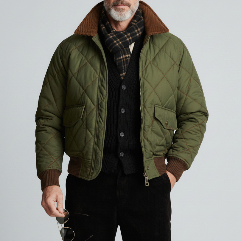 Men's Army Green Contrast Shirt Collar Long Sleeve Flap Pocket Zipper Quilted Jacket