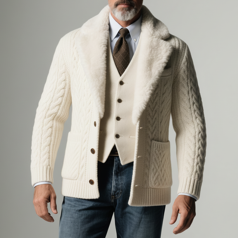 Men's Beige Fur Collar Long Sleeve Button Patch Pocket Cable Knit Cardigans