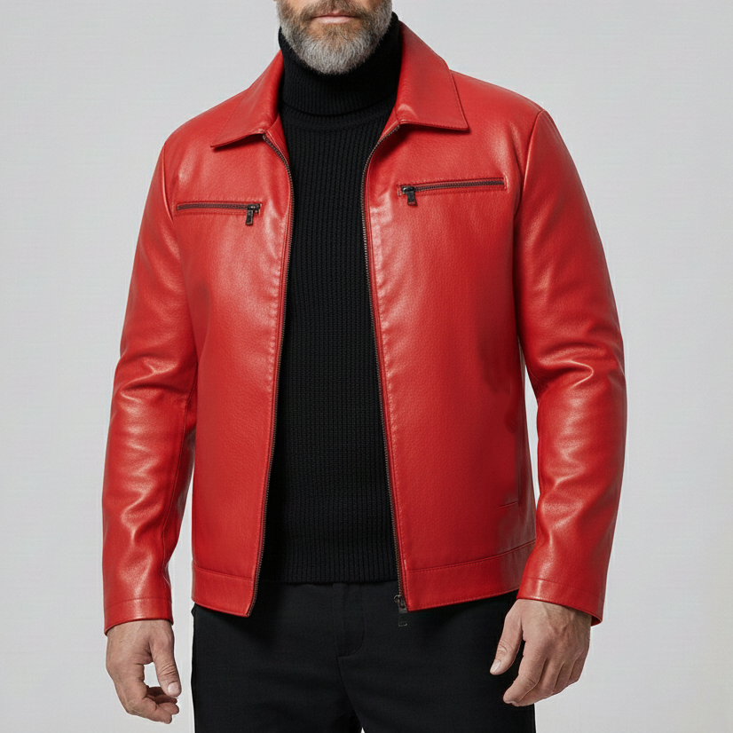 Men's Fashion PU Leather Red Shirt Collar Chest Pocket Zip Up Long Sleeve Jackets