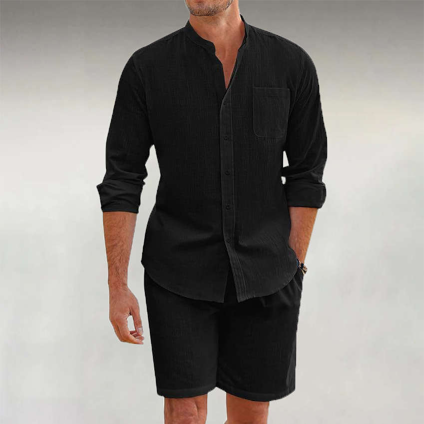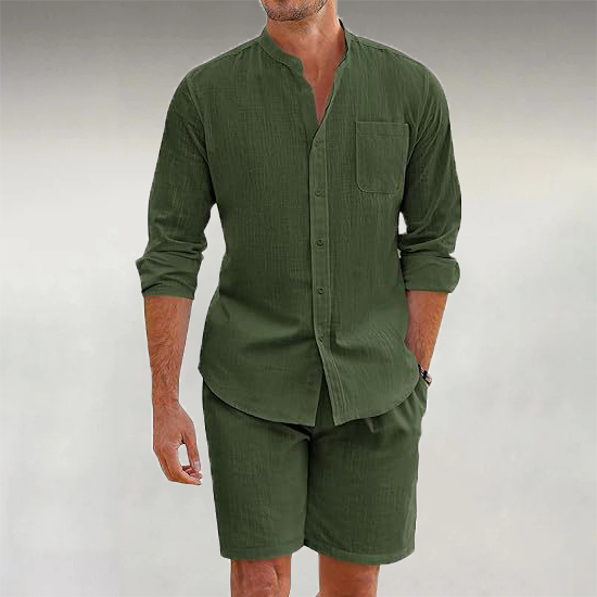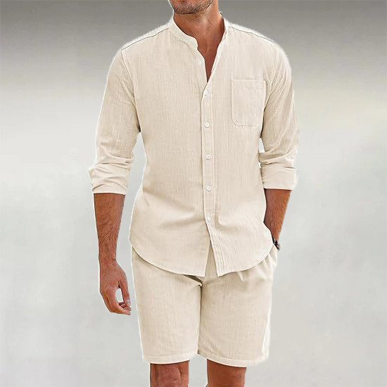 Men's Linen Stand Collar Casual Long Sleeve Shirt & Shorts 2Pcs Set