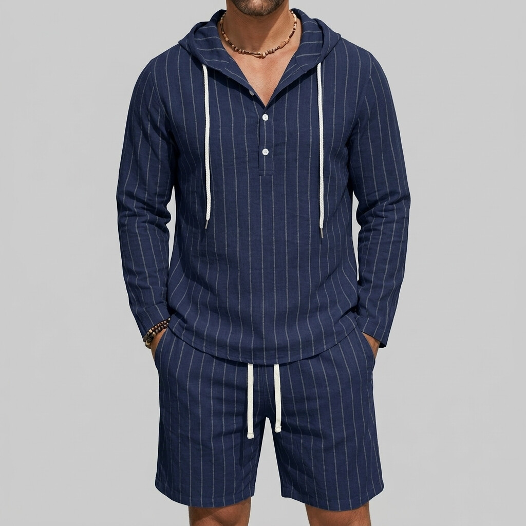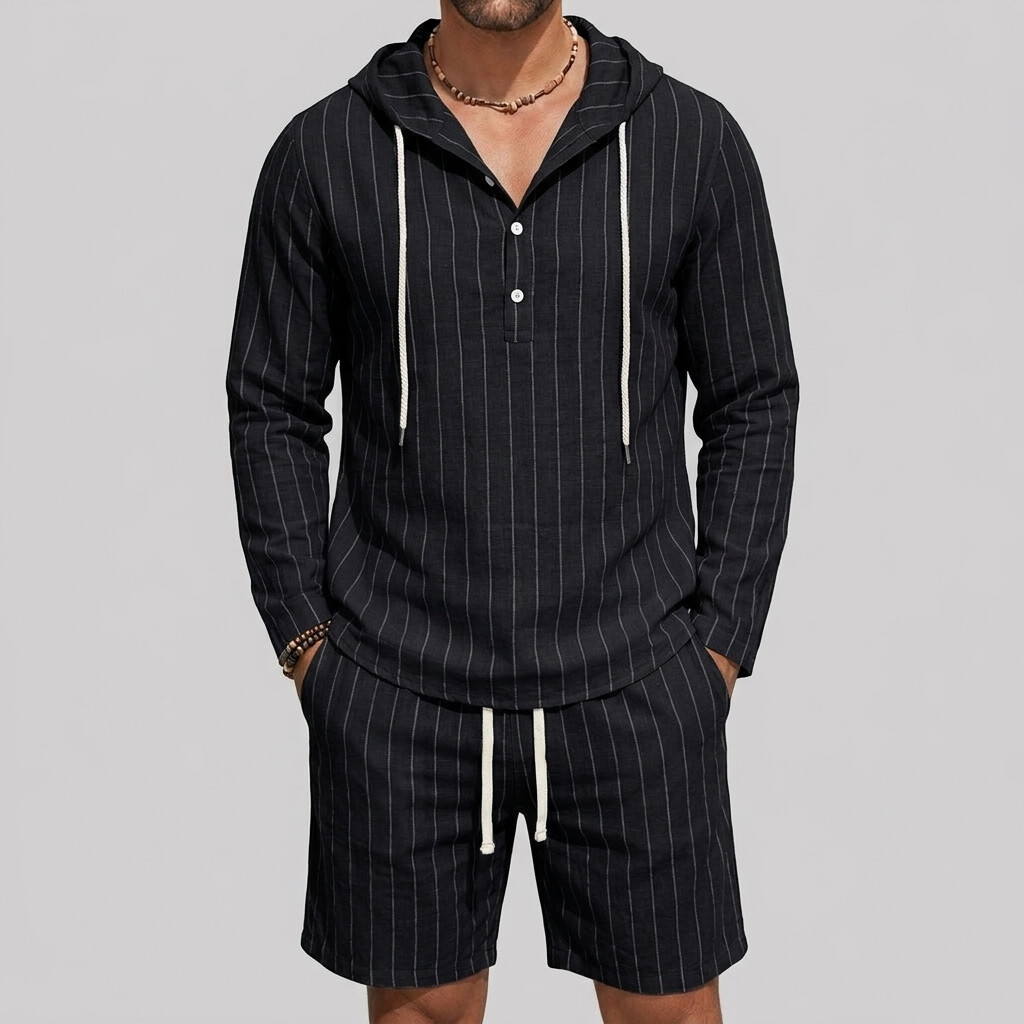 Men's Pinstripe Print Long Sleeve Half Placket Hooded Shirt & Drawstring Shorts 2Pcs Set
