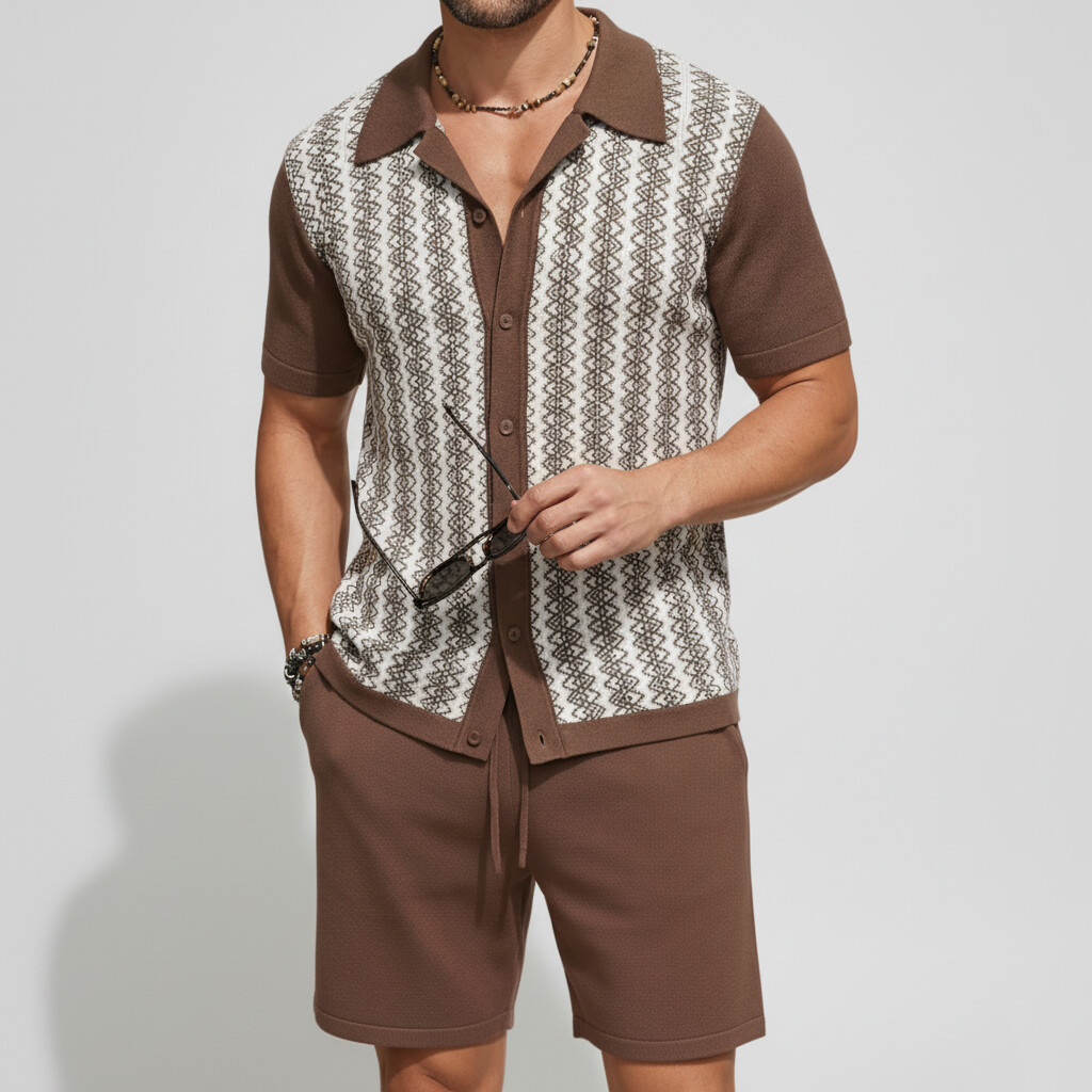Men's Vacation Color Block Short Sleeve Jacquard Knit Shirt & Shorts 2Pcs Set