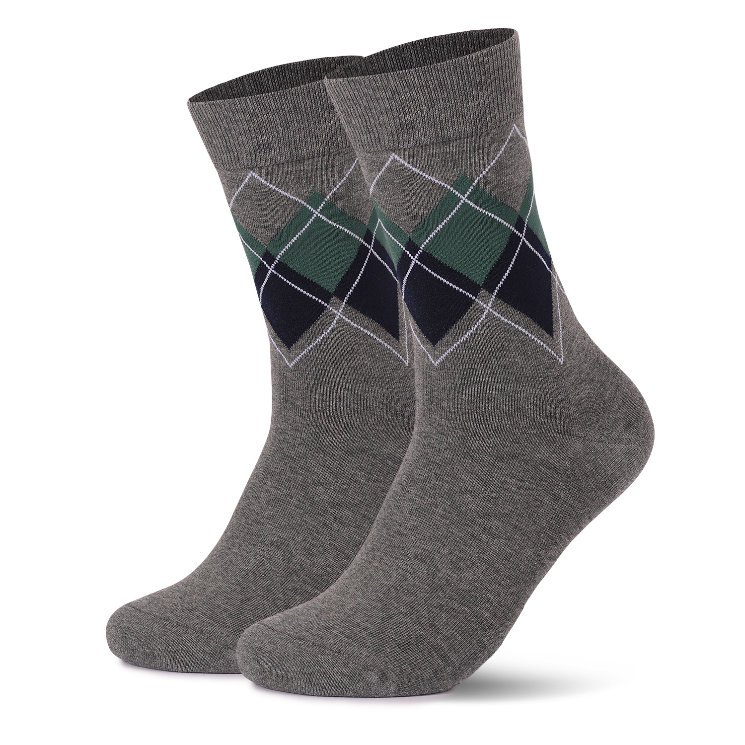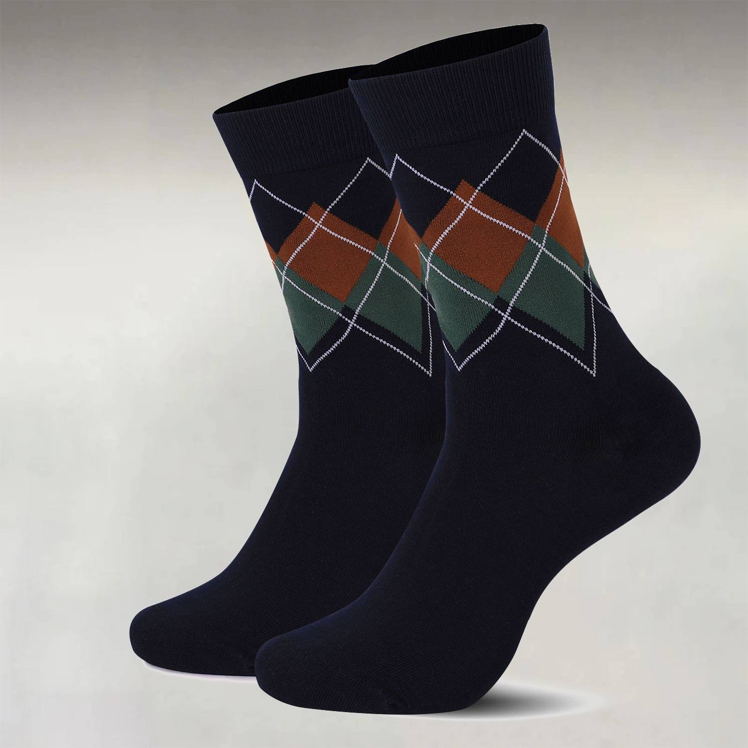 Men's Business Navy Blue Color Block Argyle Pattern Combed Cotton Crew Socks